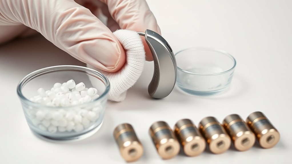 To keep your hearing aids working well, I recommend cleaning them regularly with warm, soapy water and drying thoroughly before reattaching. Always remove and replace the batteries with fresh ones, and store them in a cool, dry place. Also, use dehumidifiers or drying kits to prevent moisture buildup. Maintaining a clear line of sight and updating firmware helps keep their connectivity strong. Keep going to discover more tips for ideal hearing aid care.