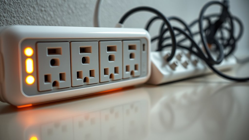 On the other hand, a surge protector is designed with safety in mind. It has built-in components that absorb excess electrical energy caused by power surges, which can happen during storms or voltage fluctuations. This added layer of electrical safety helps protect my valuable electronics from sudden voltage spikes. However, surge protectors have limitations on their power capacity. If I connect too many high-wattage devices, I might overload it, reducing its effectiveness or damaging its internal components. It’s essential to check the surge protector’s Joule rating and maximum current capacity to guarantee it can handle my setup. Recognizing the difference in purpose between these devices is crucial for proper usage.