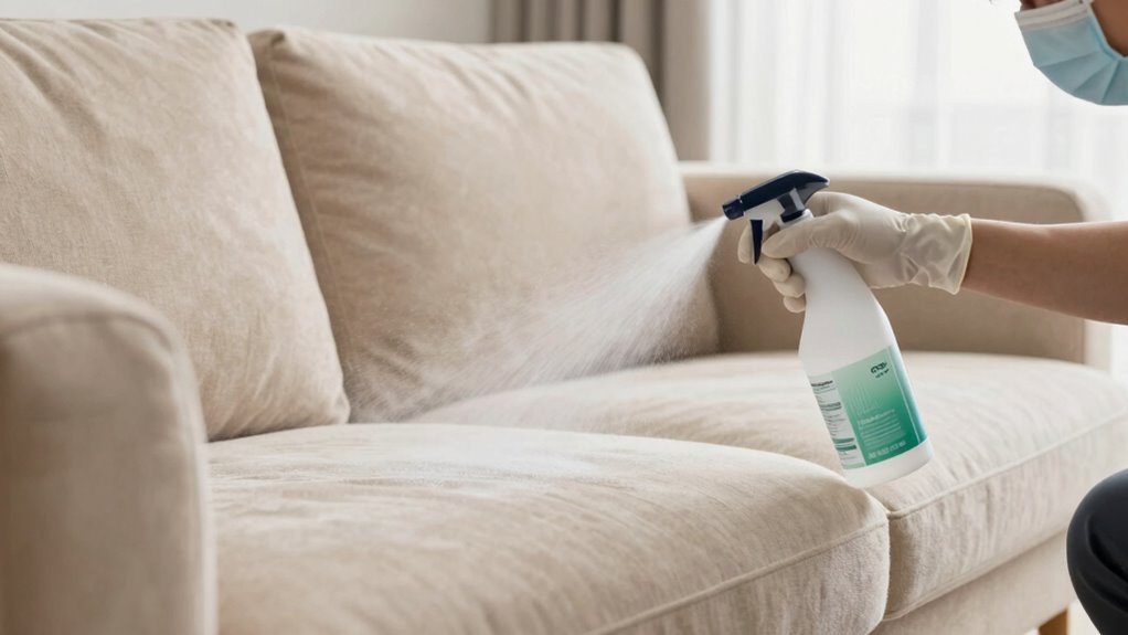 Finally, guarantee thorough drying by allowing your furniture to air out completely. Open windows, turn on fans, or use a dehumidifier if needed. For stubborn odors, consider sprinkling baking soda over the fabric once it’s dry, then vacuuming it up after a few hours. Baking soda is a natural deodorizer that absorbs persistent smells. By carefully selecting your detergent, treating stains promptly, and following proper cleaning steps, you can restore your upholstery’s freshness safely and effectively, making your furniture inviting once again.