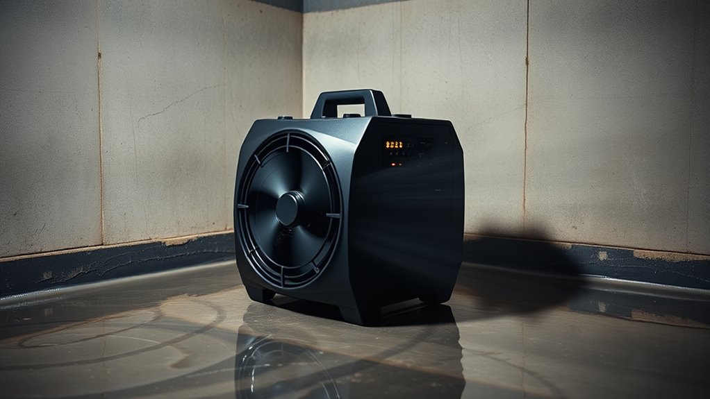 Safety and certification are top priorities when choosing an air mover for drying bathrooms and basements. I always look for units certified by reputable organizations like ETL, UL, or CETL, ensuring they meet industry safety standards. It’s vital that the device has dual thermal protection or circuit breakers to prevent overheating and electrical hazards. For moisture-prone areas, I prefer models with GFCI outlets or built-in GFCI protection, reducing the risk of electrical shocks. I also check that the construction uses durable, non-corrosive materials suitable for high-humidity environments, which supports safety and longevity. Proper grounding and electrical certifications are essential to minimize risks during operation. Prioritizing these safety features helps me choose reliable, safe air movers that protect my home and ensure effective drying.