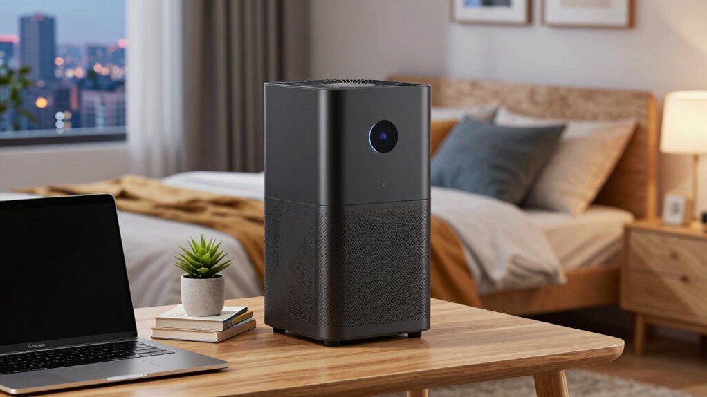 Noise levels play a significant role in selecting an air purifier for a dorm room, where peace and quiet are essential for studying and sleeping. Many models operate at as low as 22 to 27 decibels in sleep or quiet modes, which is as quiet as a whisper or rustling leaves. However, noise can increase with higher fan speeds, so adjustable settings are helpful for balancing purification and silence. Some purifiers include sleep modes that prioritize minimal sound output, ensuring they don’t disturb rest or focus. Measuring noise in decibels helps you choose a device that won’t be disruptive. Opting for a low-noise air purifier is vital for maintaining a comfortable environment, especially when you’re trying to concentrate or get a good night’s sleep in your dorm.