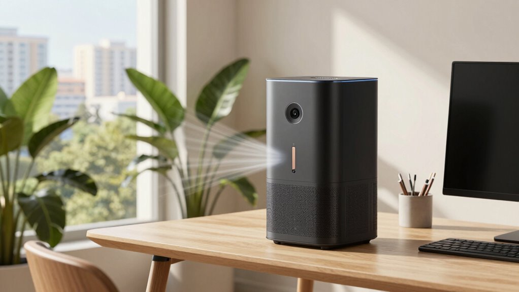 To guarantee a productive home office environment, paying attention to noise levels is essential, as even subtle sounds can disrupt concentration. Ideally, an air purifier should operate at 22dB or lower, producing minimal noise that won’t interfere with work or focus. Many models include sleep modes that reduce noise and dim lights, making them perfect for working or resting. The quietest purifiers operate around 20-25dB, comparable to a whisper, allowing for undisturbed concentration. It’s important to check manufacturer decibel ratings when selecting a model, as noise above 50dB can be distracting during tasks or meetings. Choosing a quieter air purifier helps maintain a calm environment, ensuring productivity without unnecessary disruptions.
