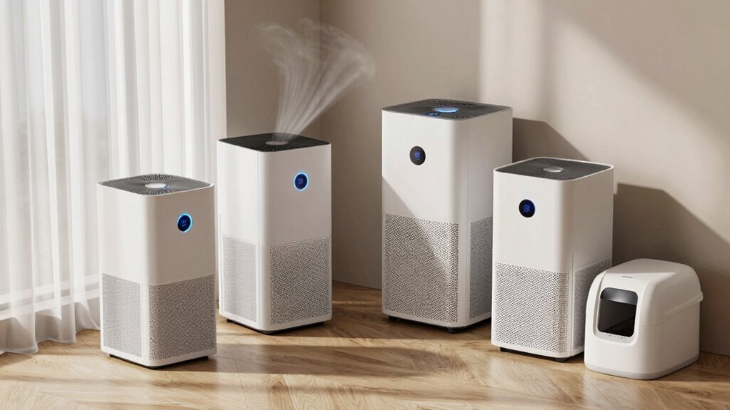 Selecting the right filtration technology is essential for effective litter box odor control, as each type targets pollutants differently. HEPA filters are excellent at capturing tiny airborne particles like pet dander and dust, removing at least 99.97% of particles as small as 0.3 microns. Activated carbon filters excel at adsorbing odors, VOCs, and chemical fumes, neutralizing smells effectively. UV-C light technology kills airborne bacteria and viruses, contributing to a healthier environment alongside odor control. Negative ion generators cause particles to clump and settle out of the air, reducing allergens and odors. Ozone generators produce ozone molecules that oxidize and neutralize odor-causing compounds, but they require careful use to avoid respiratory irritation. Understanding these options helps you choose the best purifier for your needs.