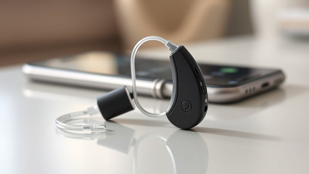 When choosing Bluetooth hearing aids for my iPhone, discreet design options are a top priority to keep my devices subtle and unobtrusive. I look for styles like invisible-in-canal (IIC) or receiver-in-the-canal (RIC), which sit deeply in the ear canal or behind the ear, making them less noticeable. Many models use soft, skin-tone materials and ergonomic contours to blend seamlessly with my ear, reducing visibility during daily activities. Some hearing aids feature nearly invisible profiles, perfect for those who want Bluetooth connectivity without drawing attention. Customizable sizes and shapes ensure a secure, comfortable fit while maintaining a low profile. Thanks to advances in miniaturization, these discreet devices now pack advanced features without sacrificing their subtle appearance.