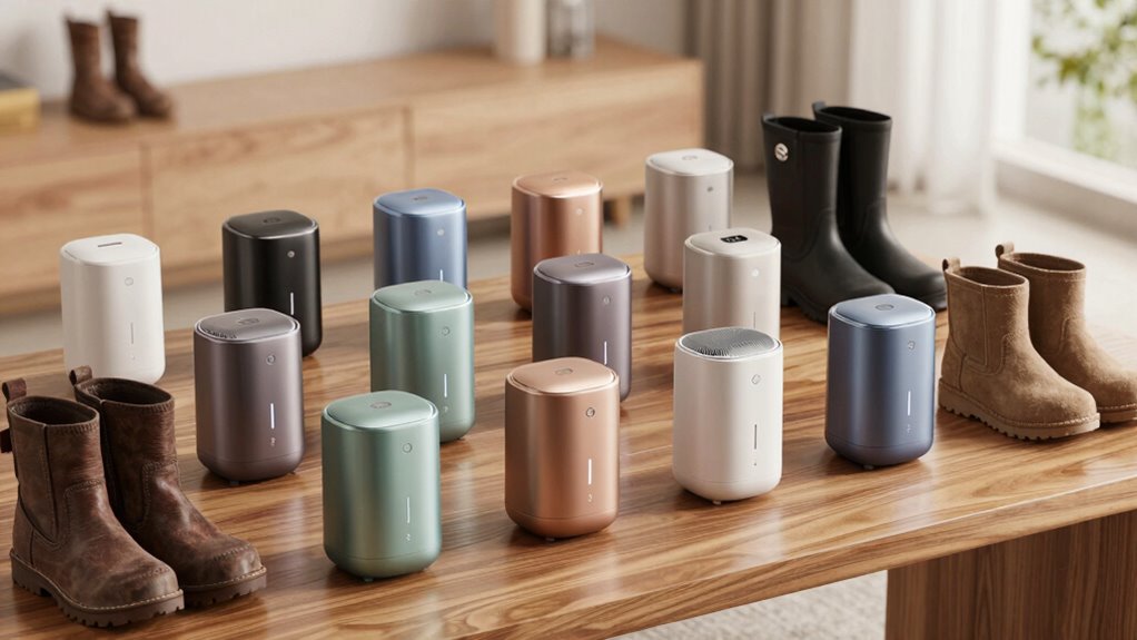 Imagine a gentle breeze sweeping through your boots, leaving them fresh and dry—this is how energy-efficient these devices are. They use minimal power, often equipped with smart sensors that optimize operation, reducing waste. I’ve found many models to be eco-friendly, conserving energy while effectively drying and deodorizing. So, you can keep your footwear fresh without worrying about high energy bills or environmental impact, making them a smart, sustainable choice.