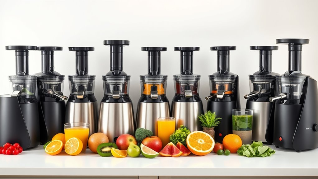 Safety features are vital components that guarantee smooth and secure operation of a cold press masticating juicer. I look for models with automatic shut-off functions that activate when the lid is opened, preventing accidents. A safety lock mechanism is also essential, ensuring the juicer only runs when the lid is securely closed, reducing the risk of injury. Non-slip suction cups keep the machine stable during use, minimizing slipping or tipping. Additionally, features like knife-free designs and reverse functions help clear blockages safely, so I don’t need to disassemble the machine mid-operation. BPA-free construction and child-safe feed chutes further protect my health and prevent accidental injuries. These safety features give me peace of mind and make juicing safer for everyone.