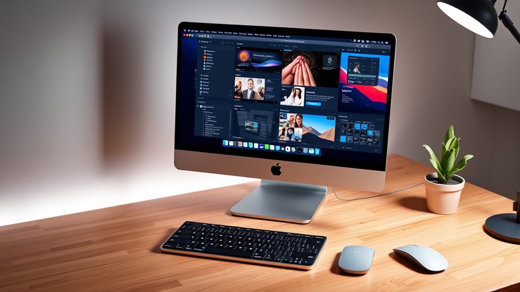 When selecting a compact workstation Mac, prioritizing display quality is essential for guaranteeing accurate and vibrant visuals. A high-quality display with a wide color gamut, like P3 or DCI-P3, guarantees true-to-life colors crucial for creative tasks. Supporting HDR content with peak brightness up to 1600 nits enhances contrast and detail in both dark and bright scenes. ProMotion technology, offering refresh rates up to 120Hz, delivers smoother scrolling, editing, and rendering experiences. For professional work, resolutions of at least 6K or 8K are vital, especially when managing multiple external displays or ultra-high-definition content. Deep blacks, high contrast ratios, and accurate color reproduction create immersive visuals, making every detail pop. These features ensure that your visual experience remains precise, vibrant, and reliable for demanding workflows.