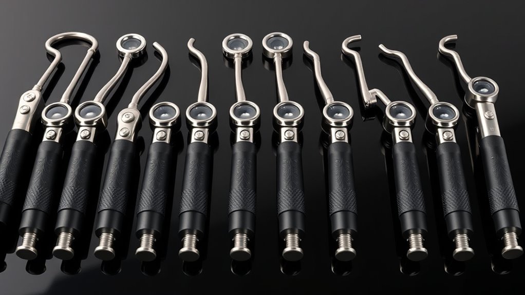 Ease of use is crucial when selecting a handheld polarized dermatoscope, as intuitive controls and simple operation can considerably streamline examinations. Look for models with one-button operation or toggle switches that make switching modes quick and effortless. Adjustable light modes—polarized, non-polarized, UV—should activate easily, allowing seamless transitions depending on the exam. Ergonomic design is equally important; lightweight construction and comfortable grips reduce fatigue during extended sessions. Clear, sharp images with minimal setup complexity help you focus on diagnosis rather than device operation. Additionally, straightforward smartphone or external device integration simplifies capturing and sharing images, saving time and effort. Prioritizing these features ensures a smooth, efficient examination process, making your skin assessments more effective and less stressful.