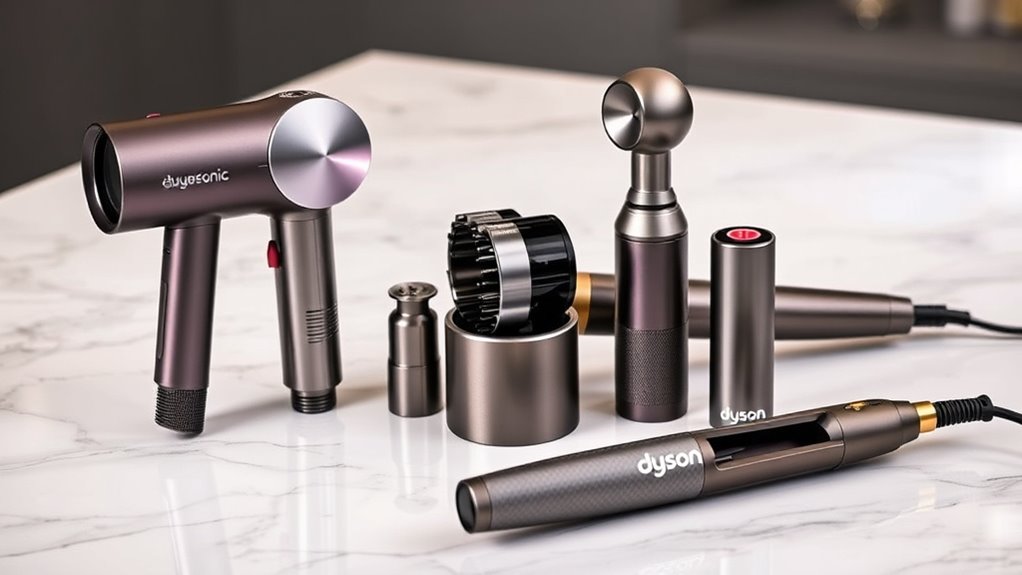 Have you ever wondered how to choose a Dyson styling tool that truly suits your hair type? The key is to look for adjustable heat and airflow settings that can handle everything from fine to coarse hair. Check if the device has attachments designed for your specific hair type, like diffusers for curly hair or concentrators for straight styles. Temperature regulation technology is essential to prevent heat damage, especially if your hair is delicate or thin. Also, consider whether the tool is suitable for your hair length and thickness—some models are better for long or thick hair. Matching the tool’s features to your hair type ensures better styling results and healthier hair over time.