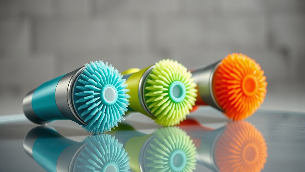 A variety of brush heads substantially boosts an electric spin scrubber’s effectiveness across different cleaning tasks. With options like flat, corner, and pointed heads, I can tackle a wide range of surfaces and tight spaces. Interchangeable heads make it easy to target crevices, grout lines, or large surfaces like floors and walls. Soft bristle options are gentle enough to clean delicate surfaces such as glass, tiles, or car paint without scratching, yet still deliver strong cleaning power. The different sizes and shapes enable me to clean everything from small accessories to expansive areas efficiently. Plus, secure locking mechanisms make replacing brush heads quick and simple, ensuring I maintain consistent cleaning performance without hassle. Having versatile heads truly maximizes the scrubber’s utility.