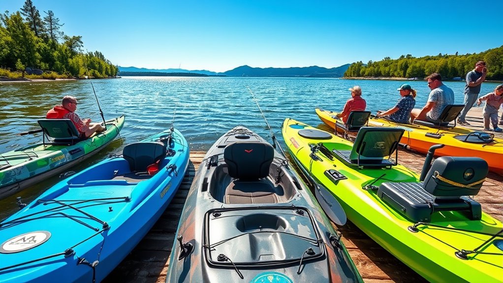 I’ve found that hull designs greatly influence a kayak’s stability and speed. Flat hulls tend to offer excellent stability, ideal for fishing, but they’re usually slower. V-shaped hulls cut through water more efficiently, boosting speed but sometimes sacrificing stability. I prefer a hybrid design, which balances both, making it versatile for different fishing conditions. Exploring different hull types helps me choose the right kayak for my needs.