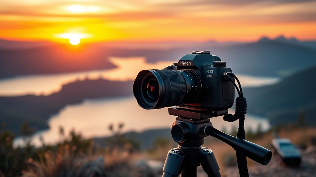 Video capabilities are just one part of the puzzle when choosing a full-frame mirrorless camera; lens compatibility and options play a significant role too. You’ll want to verify the camera system supports a wide range of native and compatible third-party lenses that match your photography needs. Check for an extensive selection of focal lengths, including wide-angle, standard, telephoto, and macro lenses, to give you versatile shooting possibilities. It’s essential to confirm the mount type—like Sony E-mount, Canon RF, or Nikon Z—and its current and future lens options. Specialty lenses, such as tilt-shift or portrait lenses, can enhance your creativity. Finally, consider the potential for using adapters to mount lenses from other systems without compromising autofocus speed or image quality.
