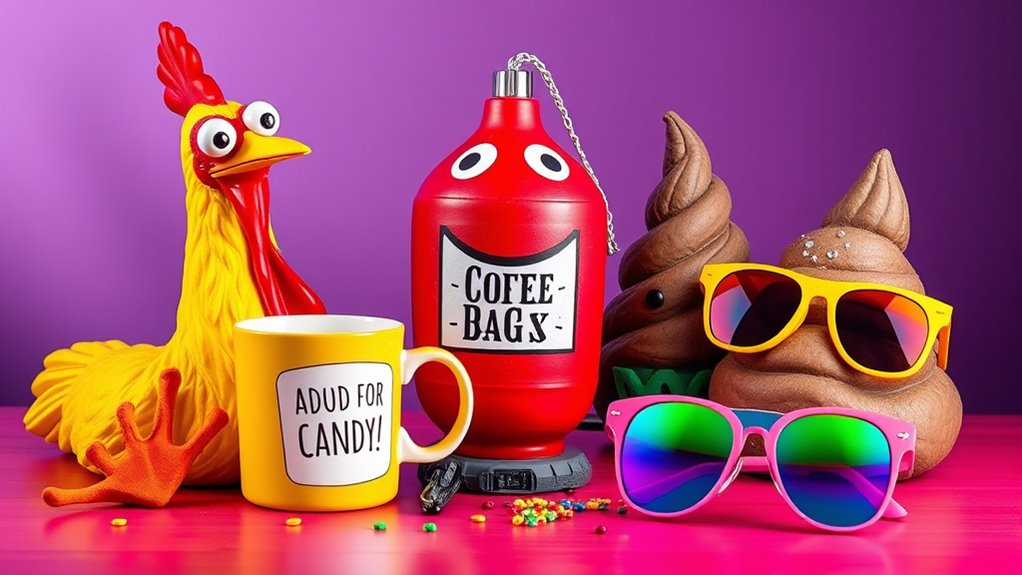 If you’re looking for hilarious gag gifts that will have everyone laughing, I recommend the Screaming Goat figure and book combo—it’s funny and educational. The People of Walmart Adult Coloring Book also offers outrageous images perfect for stress relief and laughs. For a gas of humor and aroma, try the Deez Nutz scented candle. To add some fun to the office, the adult pen set or quirky decor can brighten anyone’s day. Keep going to discover even more hilarious ideas!