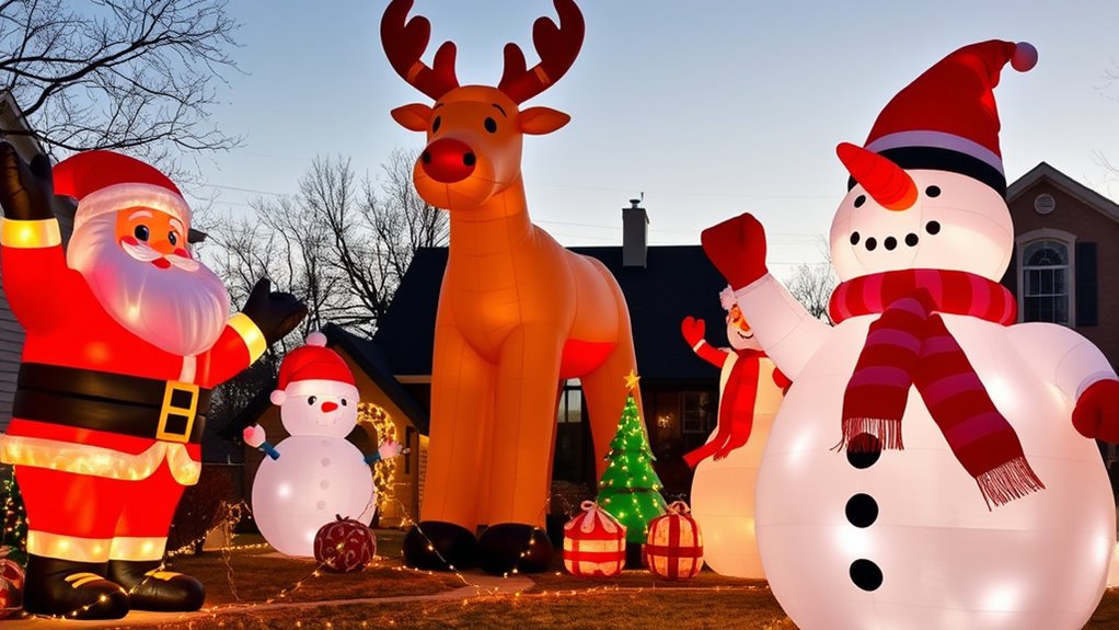 Choosing the right height for your giant holiday inflatables is essential because it directly impacts their visual impact and safety. Inflatables between 12 and 20 feet tall create a striking presence and can be seen from a distance, making your yard stand out. However, it’s important to guarantee the inflatable’s height is proportionate to your yard space to prevent toppling or obstructing views. Consider nearby structures or trees to avoid interference and ensure the inflatable complements your surroundings. Taller inflatables may need additional anchoring and stability measures to withstand wind and weather. Ultimately, the size and height should align with your decorative goals and space limitations, helping you create a festive atmosphere that’s impressive yet safe.