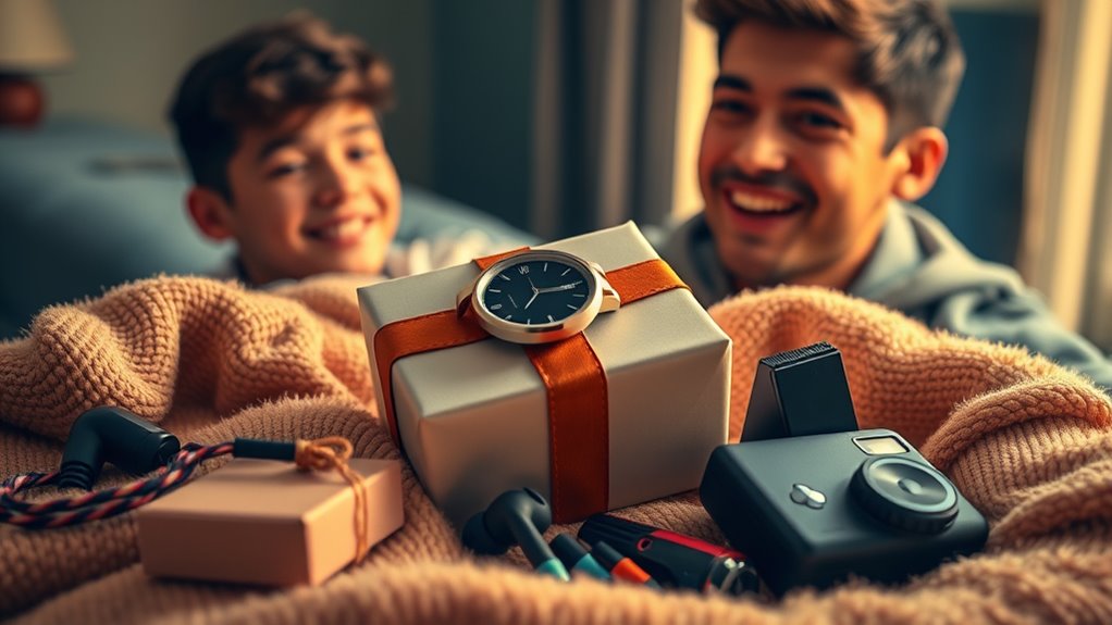Selecting the right gift depends heavily on the occasion, as it helps guarantee your present feels appropriate and meaningful. For romantic celebrations like anniversaries, personalized items or heartfelt keepsakes are perfect, emphasizing the emotional connection. For birthdays, fun gadgets or trendy accessories work well to match the festive vibe. Consider whether the event is formal or casual; a sophisticated watch suits formal occasions, while casual outings may call for relaxed gifts like a hoodie or gaming gear. Be mindful of cultural or personal traditions, as these can influence gift choices and add extra significance. Ultimately, the gift should reflect your boyfriend’s preferences and match the emotional tone of the event, making him feel genuinely appreciated and understood in that moment.