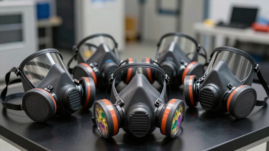 Choosing a half face respirator for VOCs hinges on its filtration effectiveness, which depends on several key factors. First, guarantee the filters are rated at P100 or higher, providing at least 99.97% filtration efficiency for particles. Next, verify that the filters are certified by NIOSH for protection against organic vapors and associated particulates. It’s essential to select filters designed specifically for organic vapors, often used alongside particulate filters for thorough protection. Regularly inspect the filters and replace them as recommended by the manufacturer to maintain peak performance. Finally, confirm the respirator creates a proper seal, preventing unfiltered air from bypassing the filter media. This combination of ratings, certification, maintenance, and fit ensures maximum filtration effectiveness against VOCs.