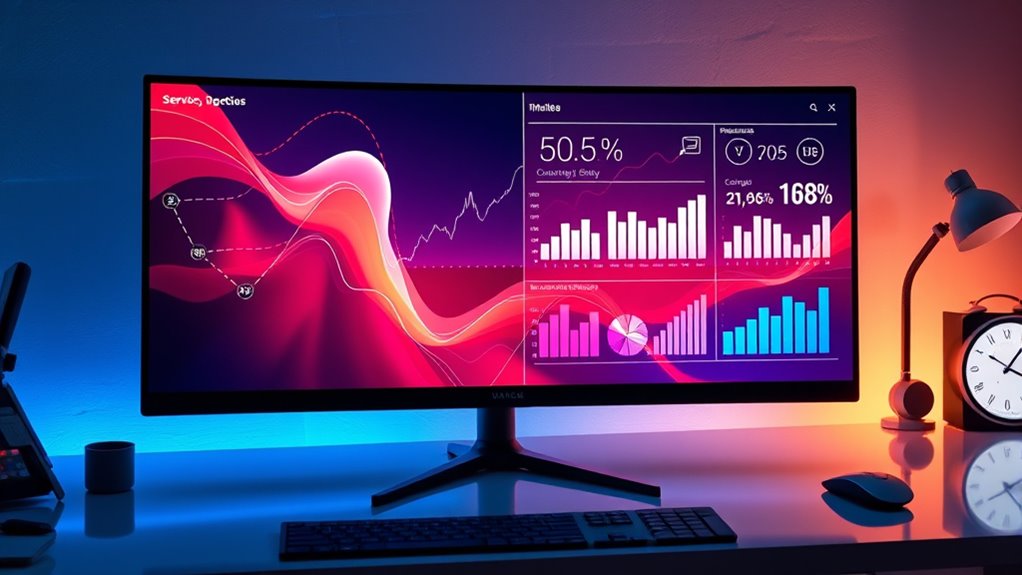 Imagine your workspace as a sanctuary—ergonomics are the keys that unseal comfort and focus. For long-term monitor use, adjustable height and tilt are essential, letting you find your perfect eye level. A monitor with a flicker-free screen and blue light filter protects your eyes from fatigue. Plus, a curved display can wrap you in a cocoon of comfort, helping you stay productive without strain or distraction.
