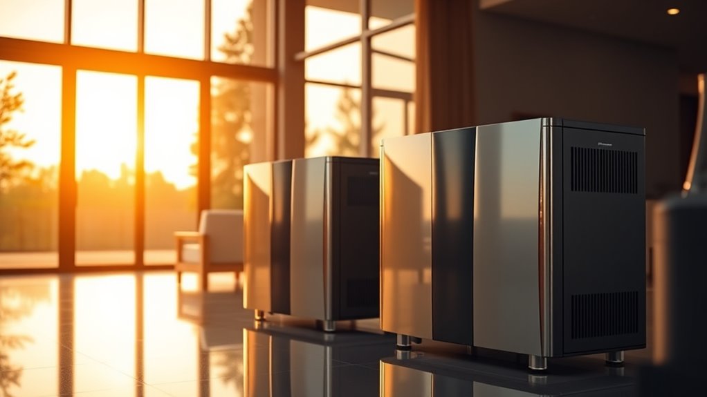 Voltage regulation features are essential for ensuring that your high-end home battery backup system delivers stable power to all your devices. These systems automatically correct minor voltage fluctuations, which means you won’t have to worry about unexpected power issues. Advanced voltage regulation can also extend battery life by reducing unnecessary cycling caused by frequent small variations. Look for systems that handle input voltage ranges of around 100V to 140V or more, maintaining a consistent output. Voltage regulation can be achieved through tap-changing transformers, solid-state components, or digital control algorithms, all aimed at precise voltage stabilization. Reliable voltage regulation minimizes wear on your sensitive electronics, protecting them from damaging power surges, sags, or transient spikes. This protection is invaluable for your home.