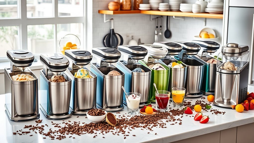 When I choose a high-end ice cream maker, the versatility of recipes is a top priority. I love that many machines come with preset programs for making ice cream, gelato, sorbet, and frozen yogurt, which means I can whip up a variety of treats effortlessly. The ability to create custom recipes lets me control ingredients, which is perfect for my dietary needs. Advanced models even offer functions like re-spinning or refreezing, allowing me to adjust texture and creaminess. Built-in timers and auto-shutoff features make tackling complex recipes a breeze. Plus, I can experiment with different mix-ins like nuts, chocolate chips, and fruit purees, opening up a world of flavor combinations that keeps my creations exciting.