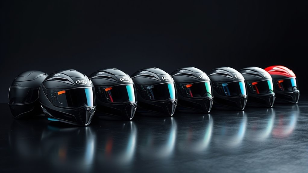 If you’re looking for the best high-end motorcycle helmets that combo safety and style, I’ve got you covered. These helmets meet top safety standards like DOT, ECE, and SNELL, featuring lightweight, durable shells and advanced impact absorption layers. They also offer sleek designs, multiple visors, ventilation, and comfort features that make riding easier and safer. Keep exploring to find out which helmets stand out for their innovation, fit, and eye-catching style.