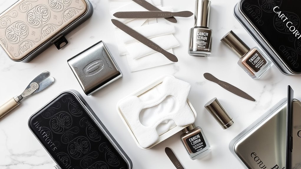 Design and ergonomics play a key role in choosing high-end nail care kits because comfortable, well-crafted tools enhance precision and reduce fatigue during use. I look for kits with tools featuring ergonomic designs, like contoured handles and non-slip grips, which make handling easier and more comfortable. Well-organized storage, such as dedicated compartments, keeps tools accessible and prevents damage or loss. The shape and size of tools—like curved scissors or angled cuticle pushers—are crafted to fit natural hand movements, reducing strain and boosting control. Materials like stainless steel with smooth edges and polished finishes add durability and a refined feel. Attention to detail, such as lightweight construction and balanced weight distribution, improves handling and minimizes fatigue, ensuring a comfortable grooming experience every time.
