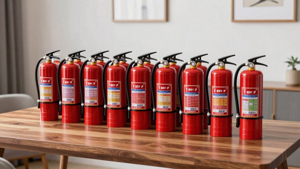 Since home fire extinguisher sets are designed for long-term use, understanding their maintenance requirements is crucial to guarantee they remain effective. Most multi-pack sets have a long shelf life, often up to 12 years, and usually need only periodic inspections. Regularly checking the pressure gauge or indicator ensures the extinguisher stays charged and ready. Some models offer visual or digital readouts for easy monitoring. If an extinguisher has been used, it must be recharged or refilled unless it’s disposable. Professional servicing is recommended for rechargeable units to maintain their safety and effectiveness. Additionally, keeping detailed records of inspections and servicing helps ensure compliance with safety standards and can be useful for insurance or certification purposes. Proper maintenance keeps your fire extinguishers reliable in emergencies.