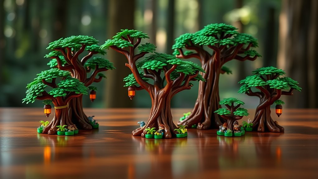 Lighting and visual effects can considerably boost the appeal of your Lego Zelda Great Deku Tree set. Effective lighting highlights intricate details, making the model more vivid and eye-catching. LED light kits often offer multiple modes like static, blinking, or color-changing effects, adding dynamic interest to your display. Proper placement of lights is key; positioning them to emphasize features like the leaves, trunk, or hidden elements creates a more mesmerizing scene. Brightness levels vary, with some kits powered via USB for increased luminosity, ensuring your display stands out even in dim environments. Seamless integration of lighting components, such as hidden wires and embedded LEDs, maintains the set’s aesthetic while enhancing visual effects. These enhancements can turn a great build into a truly mesmerizing centerpiece.