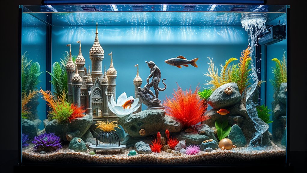 Luxury ornaments can definitely cause algae buildup or water issues if you’re not careful. I’ve seen tanks turn into green, murky messes overnight because of over-enthusiastic decorating. These accessories create nooks and crannies where algae thrive, and if not cleaned regularly, they disrupt water balance. So, I always recommend routine cleaning and monitoring water quality to keep your tank stunning and healthy—otherwise, it’s a algae invasion waiting to happen!