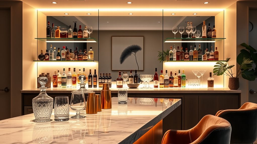 If you want to elevate your entertaining game, investing in a luxury home bar setup is a game-changer. Premium kits crafted from durable stainless steel, featuring stylish stands and complete tools, allow for professional-quality cocktails at home. From sleek designs to versatile accessories, these setups impress guests and add sophistication to any space. If you keep exploring, you’ll discover detailed options that combine elegance, functionality, and long-lasting quality to suit your style.