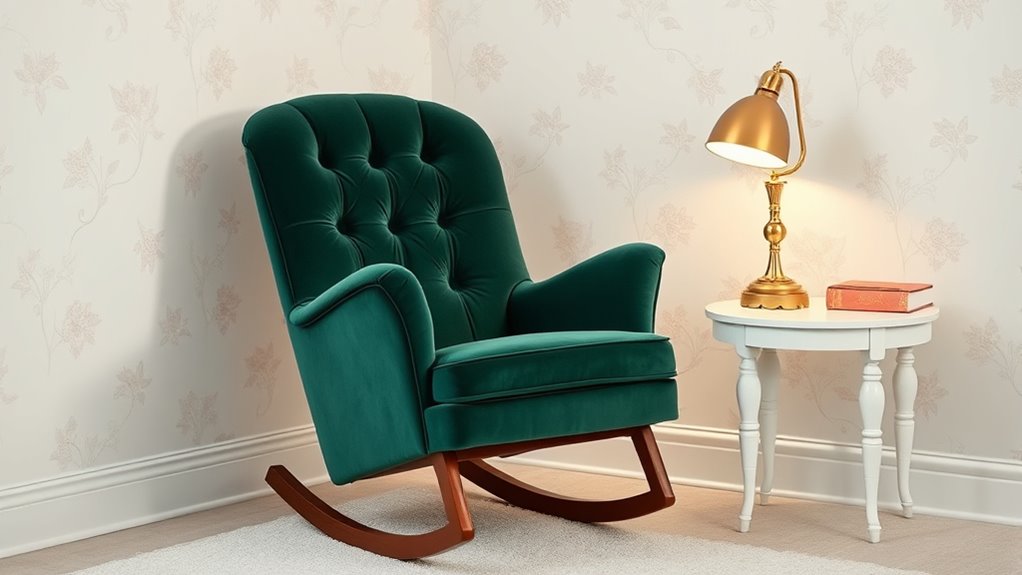 Choosing a luxury nursery rocking chair hinges on selecting materials that offer both durability and safety. I look for solid wood, steel, or heavy-duty metal frames because they provide long-term stability, ensuring the chair remains secure for years. Premium fabrics like linen, velvet, or tightly woven polyester resist wear, pilling, and stains, helping the chair maintain its appearance over time. It’s also essential that materials are non-toxic and certified, such as GREENGUARD or CertiPUR-US, to guarantee low chemical emissions, especially around infants. Well-made joints, reinforced legs, and sturdy bases prevent wobbling or sagging, adding to safety and longevity. Regular cleaning and maintenance further preserve both the look and structural integrity of the chair, ensuring it stays a reliable nursery staple.