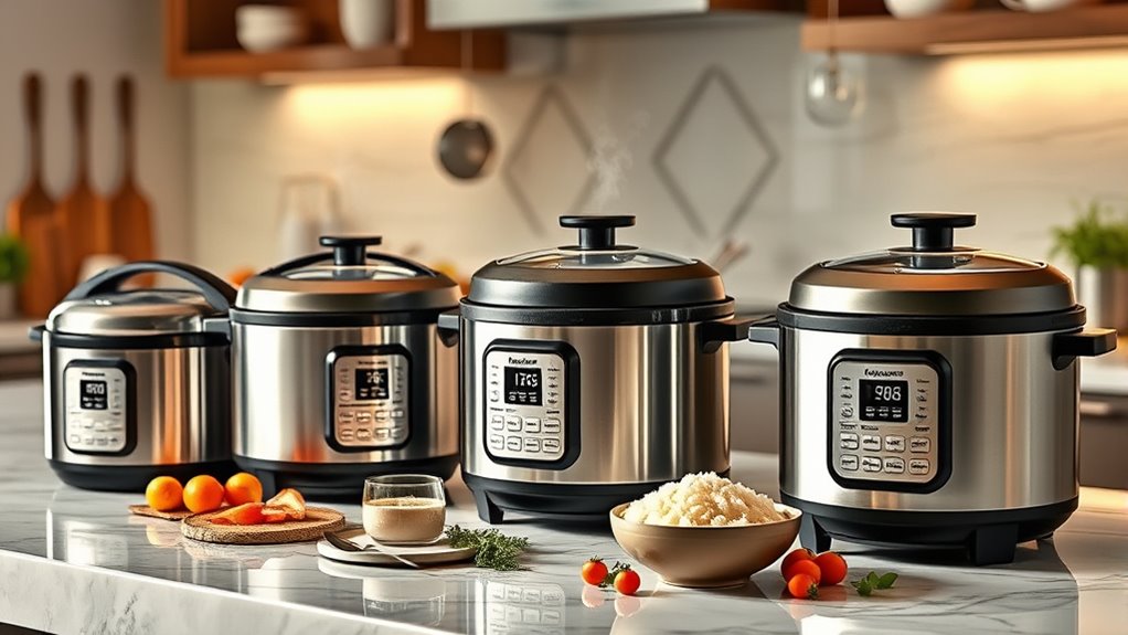 Choosing a luxury rice cooker isn’t just about functionality; it’s also about how well it fits into your kitchen’s aesthetic. When I explore options, I’m drawn to sleek, modern designs crafted from premium materials like stainless steel and glass. These finishes not only elevate the look but also complement high-end kitchens beautifully. I appreciate aesthetic details like touchscreens and illuminated displays, which enhance both the visual appeal and user experience. Many models offer customizable exteriors that can match my kitchen decor perfectly. I also value compact, ergonomic shapes with easy-to-clean surfaces, as they blend form and function seamlessly. Ultimately, it’s the attention to detail in design that emphasizes quality and sophistication, making my cooking experience all the more enjoyable.