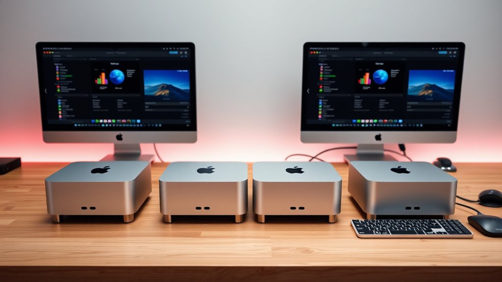 Choosing the right Mac Mini for your media server hinges on understanding your processing power needs. If you plan to stream 4K or higher resolution media, look for a processor with hardware-accelerated video decoding, like those with dedicated media engines. Handling multiple streams or demanding workflows such as live editing requires a CPU with multiple cores, high clock speeds, and ample memory bandwidth. Transcoding formats like HEVC or ProRes in real-time depends heavily on integrated hardware acceleration features. To future-proof your setup, select a model with more processing power than your current demands, giving you room to grow with higher-resolution content or additional streams. Balancing your workload requirements with CPU capabilities ensures smooth, efficient media serving without bottlenecks.