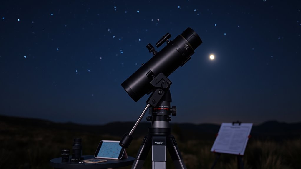 Automated software control plays a essential role in making motorized alt-azimuth mounts user-friendly for beginners by enabling precise, hands-free tracking of celestial objects. Good software compatibility with mobile devices or computers ensures seamless automation and remote operation, making setup and adjustments straightforward. Advanced features like auto-alignment, object databases, and programmable routines boost observation efficiency and ease of use for newcomers. However, firmware updates and software stability are critical—bugs or incompatibilities can disrupt tracking or imaging sessions. User-friendly interfaces combined with extensive documentation help beginners navigate setup, calibration, and troubleshooting with confidence. Overall, reliable, intuitive software enhances the beginner experience, transforming complex astronomy tasks into accessible, enjoyable activities.