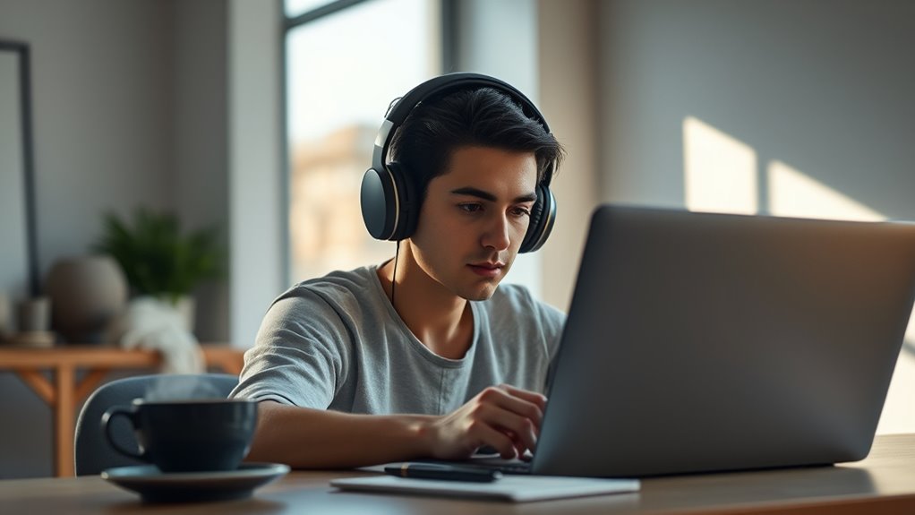 Choosing noise-canceling headphones that feel comfortable for long periods is essential for maintaining focus during remote work. Look for models with soft, breathable ear cushions made from memory foam or protein leather to prevent ear fatigue. An adjustable headband that fits different head sizes guarantees comfort over extended hours. A lightweight design, ideally under 200 grams, reduces strain on your neck and head, making all-day wear more tolerable. Features like 180° or 270° rotating earcups help achieve a better fit and lessen pressure points. An ergonomic design with cushioned padding and balanced weight distribution enhances overall comfort. Prioritizing these factors means you can wear your headphones comfortably during long work sessions without discomfort or distraction.