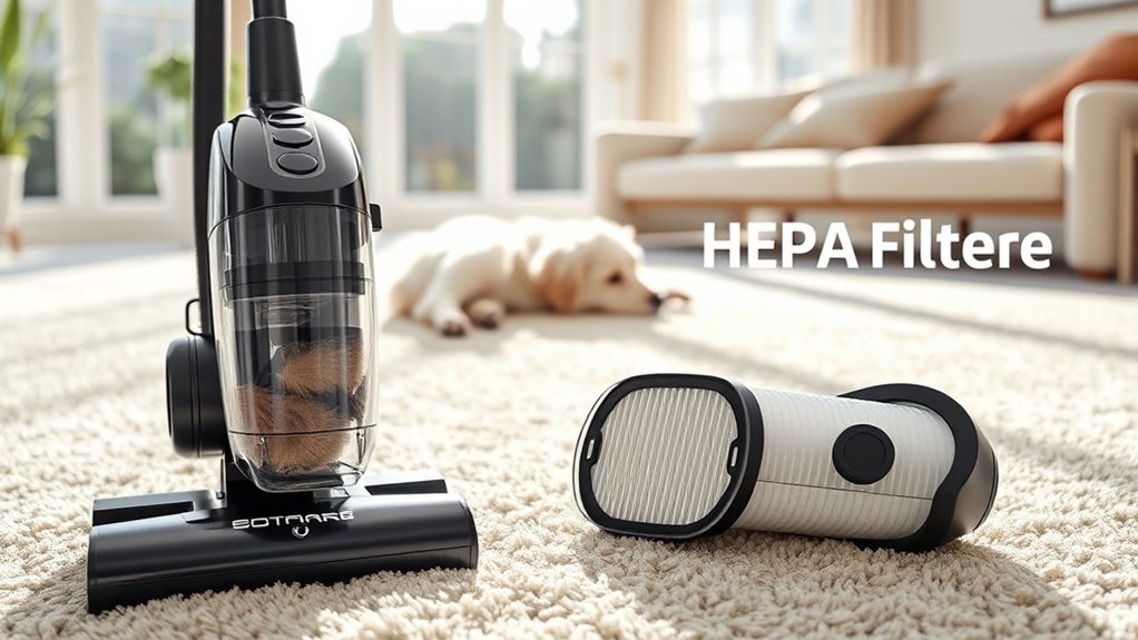 Choosing a pet hair vacuum with HEPA filters hinges on understanding filtration efficiency levels, which directly impact indoor air quality. HEPA filters are rated to capture at least 99.97% of airborne particles as small as 0.3 microns, making them highly effective at trapping allergens, pet dander, and dust mites. The better the filtration efficiency, the cleaner and healthier your indoor environment will be. True HEPA filters are tested and certified to meet strict standards, ensuring reliable performance. Keep in mind that the filter’s effectiveness depends on proper maintenance—regular replacement and a tight seal are essential. Some vacuums include multiple filtration stages, like pre-filters and activated carbon, to improve allergen removal and odor control, providing an all-encompassing approach to air purification.