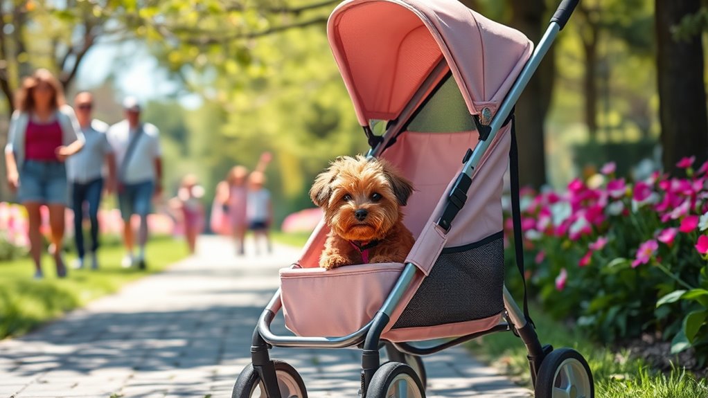When choosing a pet stroller for your small dog, safety features should be at the top of your list. Look for secure zippers, harness attachment points, and safety straps to prevent your pet from escaping or falling out. Lockable wheels and brakes are vital to keep the stroller stable on uneven terrain or inclines. Mesh panels with proper ventilation ensure airflow while stopping your dog from attempting to jump or climb out. A sturdy frame with reinforced joints and non-slip handles enhances stability and control, reducing the risk of accidents. Additionally, safety elements like reflective trim and visibility features make sure you and your pet are seen in low-light conditions, increasing safety during evening walks or cloudy days.