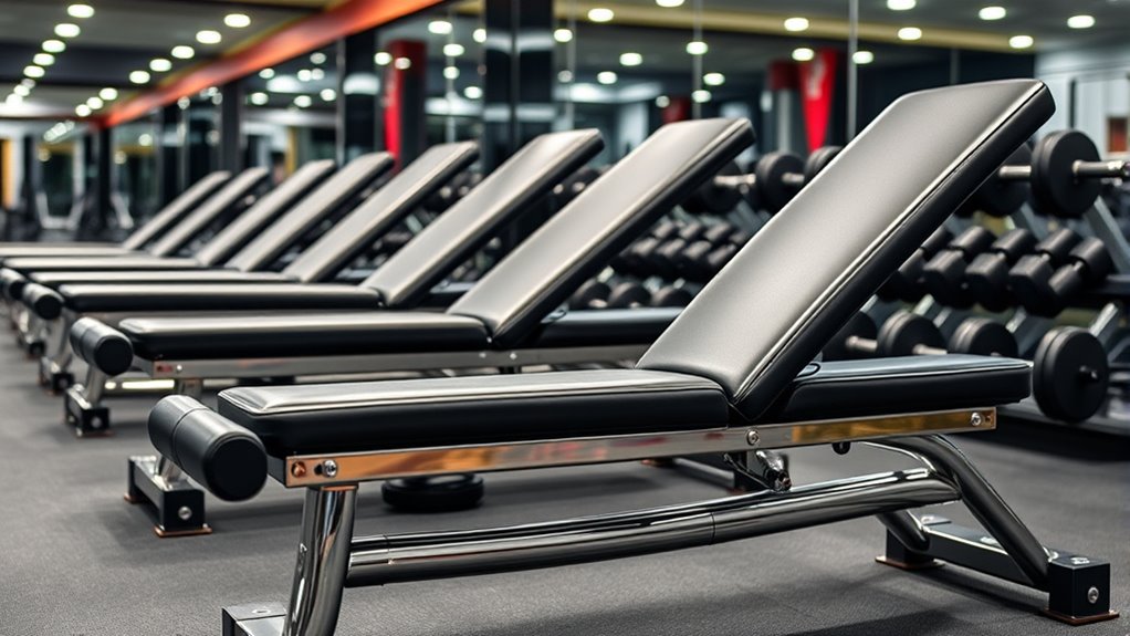A wide adjustability range is essential for maximizing the versatility of a premium weight bench. It allows me to target different muscles effectively by shifting from decline to incline positions, offering a more thorough workout. Most top benches feature at least 7 to 10 backrest angles, giving me the flexibility to customize intensity and focus. Quick and secure adjustment mechanisms, like spring locks or serrated pins, make transitions smooth and safe during my session. Some benches also include adjustable seats and leg supports, enhancing comfort and stability for various exercises and my height. This broad range of angles accommodates both beginners and advanced lifters, ensuring I can progress with my training while exploring diverse routines. Overall, adjustable options are vital for a well-rounded strength program.