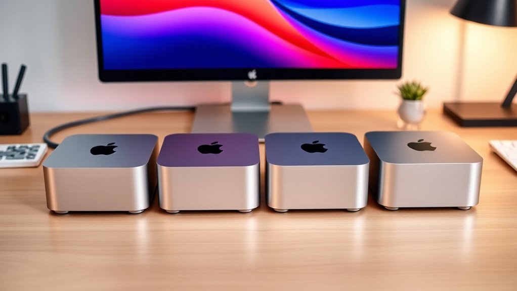 If you’re looking for affordable yet powerful renewed Mac minis in 2025, I recommend the Mac mini with the M4 chip and 16GB RAM, the model with 512GB SSD, the M4 Pro version with 24GB RAM, and the latest M4-based Mac mini from 2024. These options balance performance, storage, and price, making them ideal for various workflows. Stick around to find out which of these models best fits your needs and budget.