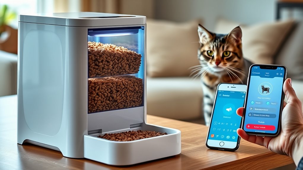 Monitoring and alert features are essential when picking a smart pet feeder because they help guarantee your pet’s needs are always met without constant oversight. With built-in cameras, I can check in on my pet during mealtime, ensuring everything’s okay. Motion sensors send alerts if there’s activity near the feeder, which helps prevent food theft or overfeeding. Notifications about low food levels, blockages, or malfunctions keep me informed, so I can address issues before they disrupt feeding. Some models even let me record custom voice messages, making mealtime more interactive and reassuring for my pet. These features give me peace of mind, knowing I’ll be alerted to any problems and can monitor my pet’s eating habits remotely, promoting better health and consistent care.