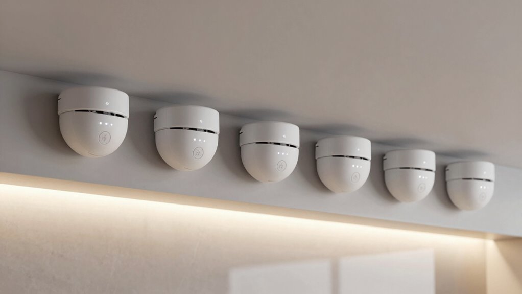 Connectivity options are essential when selecting a smart smoke detector with hush mode because they determine how easily I can monitor and control the device remotely. Most models connect via Wi-Fi, Bluetooth, or Zigbee protocols. Wi-Fi-enabled detectors use 2.4 GHz networks, providing reliable communication with mobile apps and home automation systems. Bluetooth-based models offer quick setup and direct, short-range management, perfect for local control. Zigbee and Thread protocols integrate the detectors into broader smart home ecosystems with low latency and secure mesh networking. Compatibility with voice assistants like Alexa or Google Assistant further enhances connectivity, allowing me to receive instant voice alerts and control the detector hands-free. Choosing the right connectivity guarantees seamless integration and effortless monitoring, making my home safer and smarter.