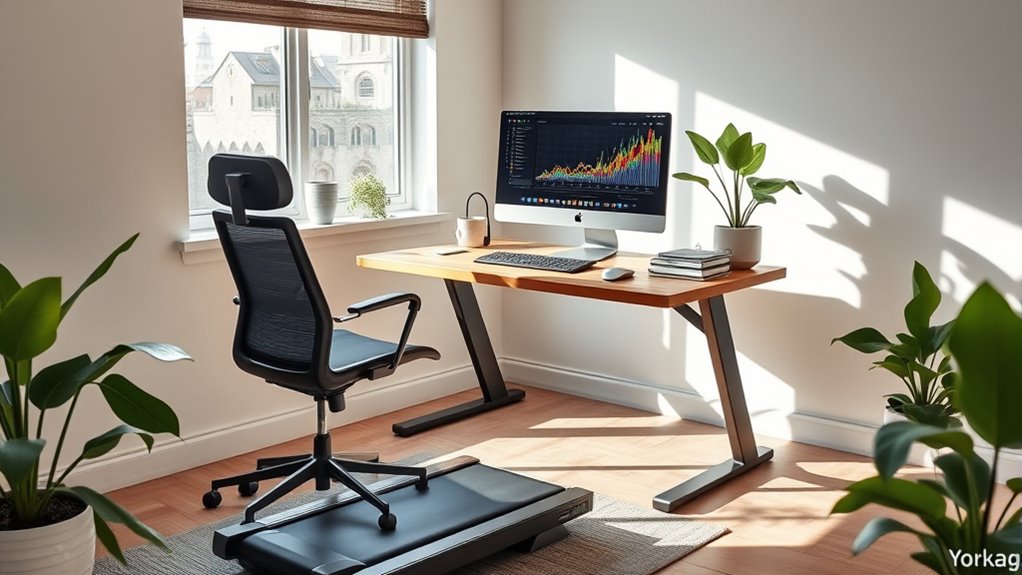 Choosing a smart treadmill desk setup that’s easy to store can make a big difference in small spaces or multi-use areas. I look for models with compact, foldable designs that tuck away effortlessly. Treadmills with built-in wheels are a game-changer, letting me move and store them without disassembly. Slim profiles and minimal footprints fit neatly in closets, under desks, or behind doors, saving space. Some models feature quick-fold mechanisms, making setup and stowing quick and hassle-free. I also prefer lightweight constructions, which boost portability and make it simple to reposition the treadmill when needed. Overall, these features help keep my workspace organized and flexible, so I can focus on productivity without clutter or space constraints.