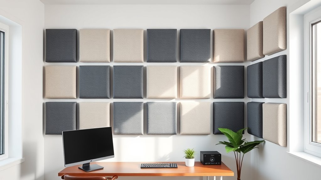 Are you concerned about how your soundproofing panels will look in your home office? The good news is that acoustic panels come in many shapes, colors, and designs, so you can easily find options that blend seamlessly with your decor. Textured surfaces like woven fabrics or geometric patterns add visual interest while still absorbing sound. Choosing panels that match or complement your wall colors and room theme helps create a cohesive look, avoiding any jarring contrasts. Modular and customizable arrangements let you design a layout that reflects your style without clutter or an industrial feel. Opting for sleek, slim profiles or artistic finishes ensures effective soundproofing without overwhelming your space. Aesthetic integration is key to making your home office both functional and visually appealing.