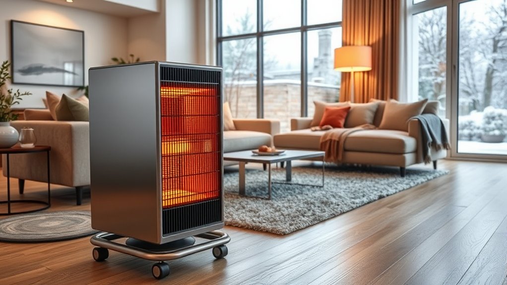 Effective heat distribution is essential for large rooms, and oscillation features play a key role in achieving this. Wide-angle oscillation, usually around 70°, helps spread warm air evenly across spaces over 500 sq ft, preventing cold spots. Heaters equipped with dual impellers or high-velocity fans boost airflow, ensuring heat reaches distant corners efficiently. Infrared heaters offer direct warmth to people and objects, which can be more effective when combined with broad oscillation for all-encompassing coverage. The placement of the heater also matters; positioning it centrally or with an oscillation angle covering the entire room improves heat distribution. By focusing on these features, you can select a heater that delivers consistent warmth, keeps the entire space cozy, and maximizes comfort during the cold winter months.