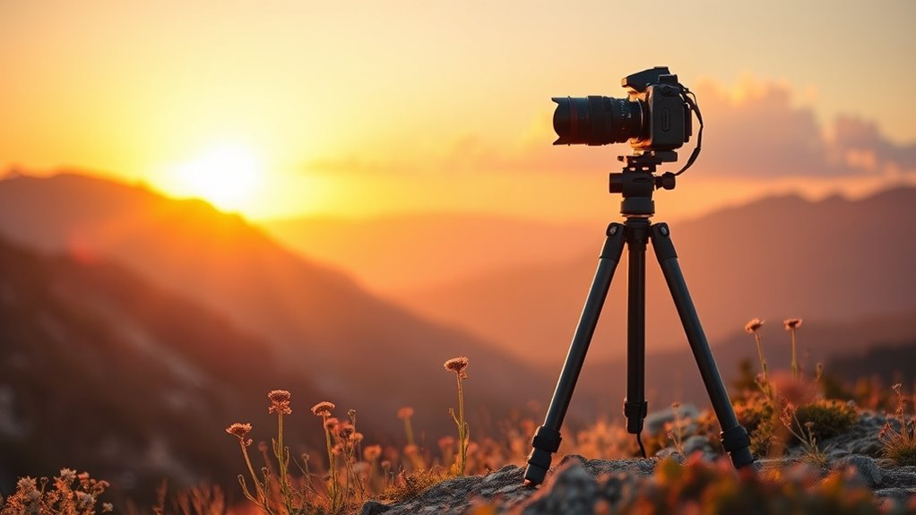 When I’m out in the field, stability on uneven ground becomes a crucial factor for capturing the perfect shot. I always look for tripods with wider leg angles and non-slip rubber feet, as they provide better stability by increasing the contact surface area. Adjustable legs with solid locking mechanisms are essential, too—they help secure my tripod on irregular surfaces, preventing any unwanted slipping. I also prefer models with center columns that have weight hooks, allowing me to add external weight for extra stability. Sturdy materials like aluminum or carbon fiber reduce vibrations, while flexible leg positioning and multiple angle settings adapt to various terrains. This way, I can confidently set up my equipment no matter where my adventure takes me.