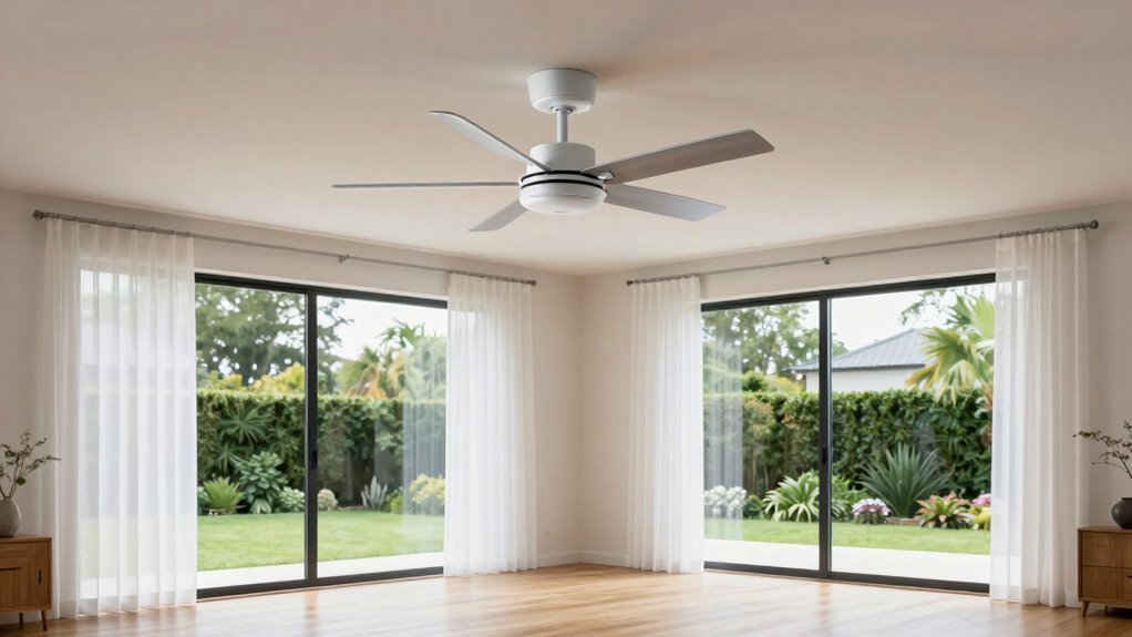 Choosing a whole house fan with high energy efficiency ratings can substantially lower your electricity bills while keeping your home comfortable. Fans with better CFM per watt ratios deliver more airflow for less power, making them more cost-effective to run. An ENERGY STAR certification or similar ratings can help you identify models that meet strict energy-saving standards. Proper sizing and installation are vital, too, because they guarantee the fan operates at its best without wasting energy through over- or under-ventilation. Many energy-efficient fans feature advanced motors like ECM or EC motors, which consume less electricity than traditional PSC motors. By prioritizing these efficiency ratings, you’ll enjoy effective ventilation while minimizing your energy costs and environmental impact.