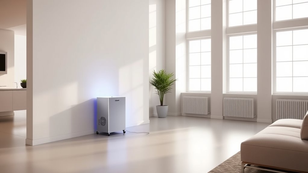 When choosing a whole room hydroxyl generator, ease of use becomes a top priority to guarantee effective and stress-free operation. Look for models with intuitive control panels, simple operation steps, and clear instructions to avoid frustration. Features like preset timers, digital displays, and straightforward mode switches make operation quick and confident. Devices that require minimal assembly and have easy-to-clean components, such as UV bulbs and filters, save time and effort during regular maintenance. Automated safety features like automatic shutoff or occupancy sensors simplify use in occupied spaces while keeping safety in check. These user-friendly features ensure you can operate the generator effectively without hassle, making odor remediation smoother and less burdensome.