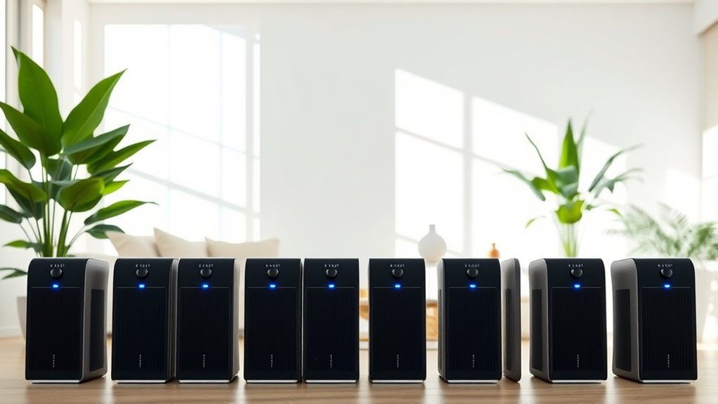 To effectively purify the air in your entire room, the key factor is the generator’s ability to produce a high volume of negative ions and ozone-free molecules that target airborne pollutants. Generators with higher negative ion outputs, often reaching millions of ions per second, are more efficient at removing dust, pollen, pet dander, and other allergens. The purification strength depends on the device’s ion generation capacity and how effectively it uses filtration or ionization technology. Ozone-free models that deliver powerful ionization can clean large spaces—several thousand square feet—by continuously neutralizing contaminants. Additionally, a good unit circulates and cleans the air quickly without generating harmful ozone, ensuring your indoor air remains fresh, safe, and consistently high quality.