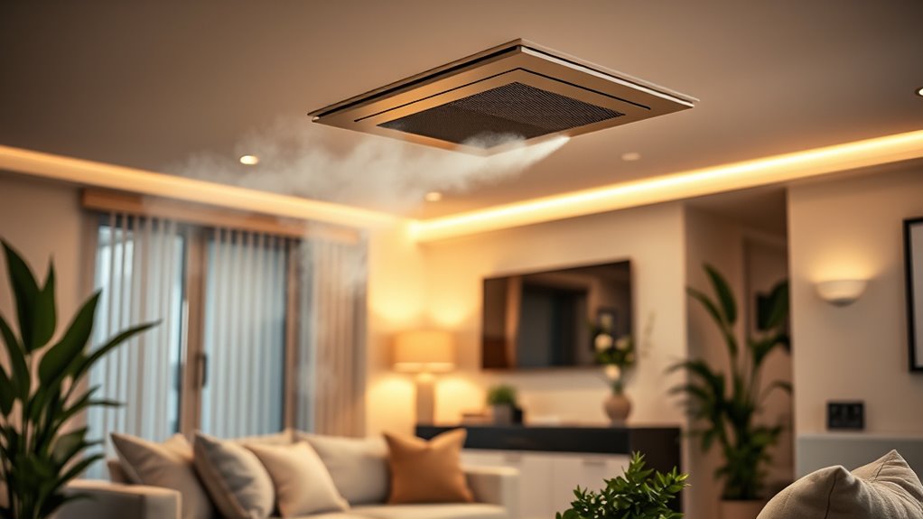 Different diffuser technology types play a essential role in ensuring your whole-home fragrance system works effectively with your HVAC. Cold air diffusion converts essential oils into ultra-fine, dry microparticles without water or heat, allowing quick, residue-free scent dispersal. Nano-diffusion diffusers use high-pressure air to atomize oils into nanoparticles, providing consistent coverage while preserving scent integrity. Nebulizing diffusers break down oils into dry mist with pressurized air, offering long-lasting, therapeutic fragrances without water or heat. Heat-based diffusers, which rely on warm air or ultrasonic vibrations, are less common for HVAC integration because they can alter scents and leave residues. Choosing the right technology depends on your preferences for scent strength, longevity, and maintenance, ensuring a seamless and effective fragrance experience throughout your home.