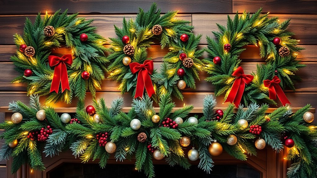 When decorating your mantel, coordinating your wreaths and garland sets with your existing decor style creates a more polished and harmonious look. I find that matching color palettes and seasonal themes between the wreaths, garlands, and surrounding decor help create a cohesive visual flow. It’s also important to select pieces that complement your home’s architectural style—whether rustic, modern, or traditional—to guarantee seamless integration. Incorporating similar materials, textures, and design motifs across your wreaths and garland sets further establishes a unified appearance. By considering the color schemes and motifs of your mantel decor, you can strategically pair wreaths and garlands that enhance and elevate your overall style, making your home feel thoughtfully curated and inviting.